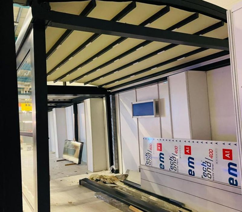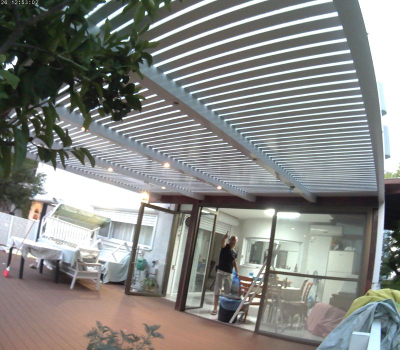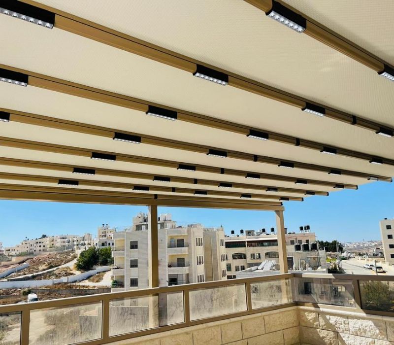 פרגולה אלומיניום פסים בצבע לבן עם תאורה וסנטף זווית 3